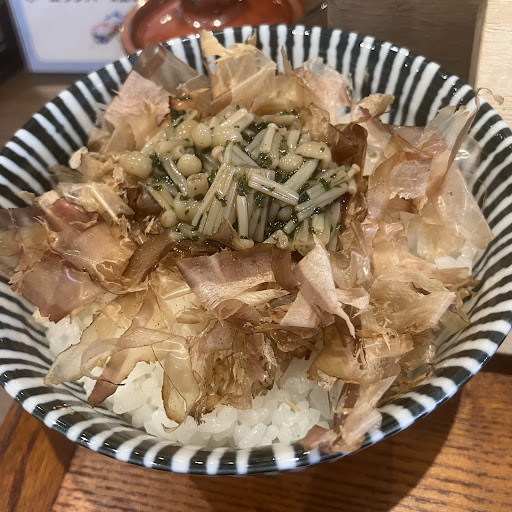 カウンター席9ですね、 食券機で食券を買います。 今回はまだ未食の貝ダシ汐そばに、ココのイチオシメニューかな!? 鮭いくら銀しゃりセット1380円にします。 後は、まぶし唐揚げ4個560円に麺大盛150円 を注文しましたよ。 卓上には、藻塩、ダシ醤油、昆布酢、一味唐辛子、和山椒の他に、自家製なめたけと鰹節が食べ放題に、銀しゃりはオカワリ無限大。 コレは嬉しいたけ〜 お腹ペッコリーノにはもってこいのサービス♬ しばらく待っていると、、、