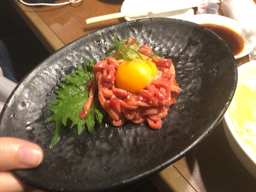 黒毛和牛ユッケは薬味とタレと肉が別々に盛られて来るのですが、チャンジャを食べた後の器等に移して薬味を載せ、タレを少しずつ加えながら味の濃淡を調節して頂くのがオススメです。タレを全量ぶっかけたら味が濃くて白飯のアテにしかならなくなります(笑)