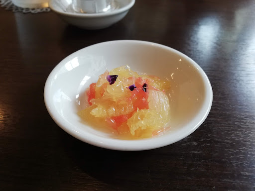 「熊猫軒」という可愛らしい名前と「麻婆豆腐が絶品」という口コミを見て訪問。 麻婆豆腐ランチコースを注文。 コースらしく、お料理について、一品ずつ丁寧に説明しながら提供してくれる。 前菜三種では、クラゲとピンクグレープフルーツの意外な組み合わせが◎。プチプチ食感。 次に出てくるよだれ鶏がめちゃくちゃ旨い。ご飯が欲しくなるが、これが「麻婆豆腐」への期待を高める。 シューマイとトマトの組み合わせが意外と合う。「熱そうだな」と思って警戒して口にしたら、やっぱり熱くて(当たり前)、警戒していて良かったと心から安堵。 メインの麻婆豆腐は、こちらが白いシャツを来ていたせいなのか、「お使いになりますよね」と紙エプロンと一緒に提供してくれた。 口コミ通り、めちゃくちゃ旨い。未知の麻婆豆腐。卓上の山椒をゴリゴリしながら食べる。 ちなみに、きちんと辛い。「辛いの苦手な人にも」という店主の熱い思いがよく伝わる、本当に旨い麻婆豆腐。が、辛いの全くアウトな人には多分相当辛い。山椒を加えると、シビレがくる辛みになり、書いてるだけで思い出して鼻の頭に汗が出る。旨い。 〆には杏仁豆腐と鉄瓶でいれたお茶。落ち着く。 店内も料理も、中華料理屋というより、創作和食の店の雰囲気。 テイクアウトの弁当注文を受注しているようで、店内は空いているが、電話注文は団体でがっつり入っていた様子。 これ、お酒と一緒ならなお旨いだろう。もし自分が地元民なら、夜に来て色々試したい。 行って良か...