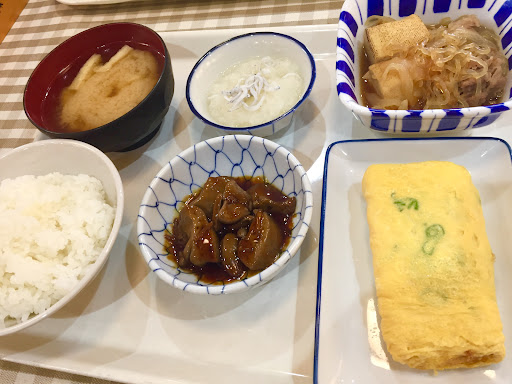 ・ご飯 ・みそ汁 ・玉子焼 ・鶏きもの旨煮 ・じゃこと大根おろし ・牛すき煮