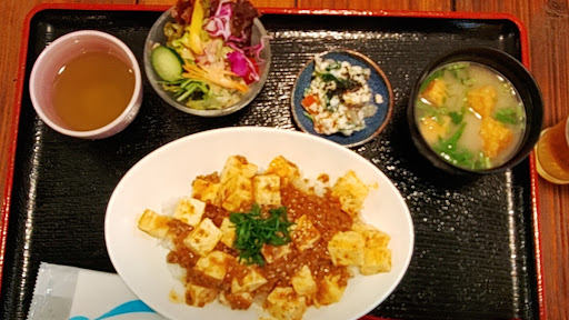 令和3年12月の昼食利用。 もともと別の場所で豆腐屋をされていたのがこちらに移転し、以前から前を通る度に気になっていたのだが中が見えない店は入りづらく、二の足を踏んでいたのだが、この日思い切って(笑)入ってみた。 店内は調理場側にテーブル席があり、反対の壁側に長いカウンター席がある落ち着いた雰囲気。 メニューを見て「麻婆豆腐定食880円」とビールを注文する。 ビールを飲みながら待っていると、料理が到着。 私が注文したのは「麻婆豆腐定食」だったが、目の前にあるのは「麻婆豆腐”丼”定食」…まあ値段も一緒だし、クレーマーでも無いので黙って食す。 麻婆豆腐は辛み控えめ、味噌汁のお揚げ等も美味しい。 特に「白和え」は甘めで俺れ好みの味。 欲を言わせて貰えれば、麻婆豆腐の豆腐が「木綿豆腐」だったが、豆腐屋さんなので、客が「木綿」か「絹ごし」と選べれば良かったかな?、柔目の豆腐が好きなので。 しかし、全体的に豆腐を使った定食類なのでヘルシー。 今後も利...