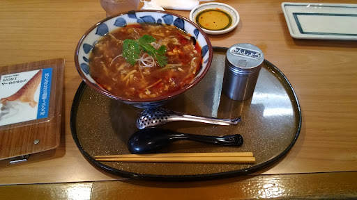 かみさんは五目うま煮麺(税込み842円)、私は酸辣湯麺(税込み842円)、二人で焼き餃子6個(税込み356円)をいただきましたが、ラーメンはどちらも美味しく、さすがは三宝亭グループと思いました。 ちなみに酸辣湯麺には缶に入った山椒が付いてきますが、特に缶を開けるとかの必要はありません。そのまま持って逆さにして振れば山椒が出てきます。ただし気を付けないとドバッと出てくるおそれがありますのでご注意ください。