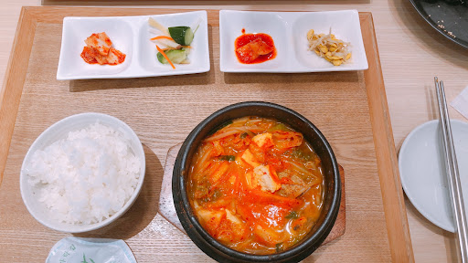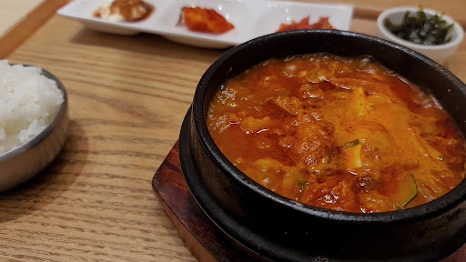 Read more1Fのレストラン街にある韓国料理屋さん。 日曜日のお昼時のおかげか、10分ほど待って入店。 店内は意外と広く、対面式カウンター席(2人用)が店内中央付近に配置され、外周にはテーブル席(4人掛け?)といった配置。 白く小綺麗な店内は、昨今の韓国系の雰囲気で想像するとおりのイメージ。 メニューはスンドゥブやチゲのセットとその他アラカルトで構成。 メニューはテーブル備え付けのタブレットより注文。ほぼご飯がセットになっており、小盛り、普通、大盛りより選択可能。 写真は普通盛りだが、そこそこのボリュームを感じられる。 セットの値段は平均1000円ほど。 味噌チゲと野菜キンパを注文。熱々のチゲが体に染み渡ります。辛さは控えめ。 味噌チゲはなんとなく日本人好みの味のよう。辛いものが苦手な方と一緒でも大丈夫かなと感じます。 野菜キンパはごま油香ってとてもおいしいです。炭水化物なのに、なんのこれしき箸が進みます。 スプーンの包み紙に韓国文字が書かれていたりと、随所にこだわりを感じます。 しっかりスープも完飲。そこそこお腹も膨れて退...