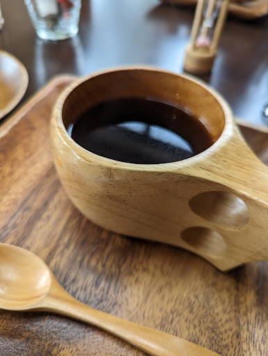 ランチは数量限定で、日替わりで今回は五泉の帛乙女の「芋煮汁と小むすびのランチ」 蕗の薹の天ぷらも添えてあり春の香りがしました。白樺をくり抜いた「ククサカップで頂くコーヒーも美味しかったです。 デザートは3、4種類の中から選べ「越後姫のいちごのシフォンケーキ」にしました。