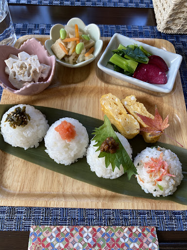 おにぎりのおかずはシーズンごとに変わるようです。芋煮が良いお出汁がきいてて染み入りました。 デザートセットのデザートは3種類から選べて、抹茶シフォンケーキにしました! セットドリンクにはしそジュースもあったので、お好きな方はぜひ。