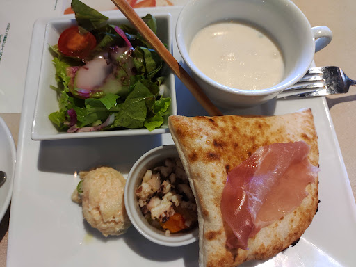 Read moreホームセンターの2階。 いつも、韓国コーナーや雑貨を見ながら 素通りしてましたが、 ランチで勧められ、伺いました。 窓側は予約席ということで、2人掛けの所を 選んで…と。 11時半なのに、もうお客さんがいっぱいでした。 おすすめや、ランチメニュー、単品など 結構品数が豊富。 写真のサラダとセットのパスタはハーフサイズ。 トマトベースか、オイルベースのパスタから 選べたり、スタッフの方の説明を良く聞かないとわからなくなります。 セットのドリンクは、おかわりできるそうで、 食前と食後に持ってきてもらうようオーダーしました。 途中、お水やセットドリンクを足しに来てくれますし、早く出て…の雰囲気もなかったので 過ごしやすいところです。 ハーフパスタ、サラダ、ドリンク、ドルチェ のセットでリーズナブルでした。 各種クレカ、Suicaなど利用できます。 Pay関係は使用不可...