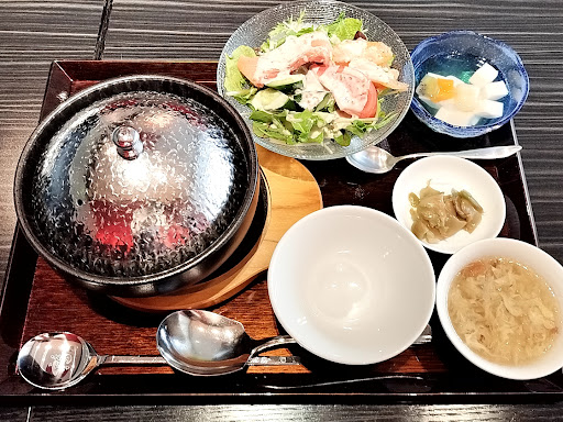 超熱々の石鍋に炒飯が入っており、目の前で蟹卵白あんかけをかけて下さいます。 グツグツと煮えたぎるので蓋をして暫く待ちます。