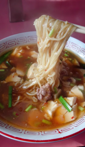 Read more町中華の老舗です。店頭のサンプルケース始め雰囲気あるカウンターの椅子や小上がりなど昭和の香りが色濃く残ってていいですねー。やっぱり落ち着きます。 いただいたのはマーボーメンと半チャーハン。 マーボーメンは見た目シャブシャブしてそうですが餡のとろみは普通にあり細麺にもよく絡んできます。そして熱々。辛さはそれほどありません。くどくない味付け。 半チャーハンはしっとりしっかりしててなんというか懐かしい感じの味ですね。添えられた漬物もいい。 マーボーメンも半チャーハンも今時珍しいくらいに塩気がきっちりと入っていて美味しかったです。中華を食べたぞーという満足感。 駐車場は店前に3台ほどと横の路地を挟んだ場所に数台分あります。