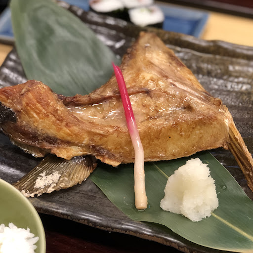 「天然特大ブリカマ塩焼定食」1620円 料理、といっても塩ふって焼いただけのものだが、それほどシンプルなものであるに関わらず美味いのは、材料の高鮮度と作り手の技量であろう。ブリの身がふわっとしているのだ。脂でジュワッとしているのだ。店員さんが 「お好みでこちらをお使いください」 とポン酢を差し出してくれる。これほど美味いのに、何を野暮なことを言い出すのか。と、試してみたらこれがまた一段と美味くなるのだ。複雑さをいや増すというか。サイドメニューとして装備されている刺身三種、中トロ、サーモン、イカも素晴らしい。