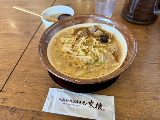 初代が「こまどり」で修業した後に独立しており、創業当初から割りスープ付きの濃厚味噌ラーメンを提供している。屋号は初代が若い頃に東京と横浜の飲食店で働いていたため、それぞれの頭文字をとって「東横」としたそうだ。
