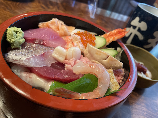 Read more友人から評判は聞いていましたが、今日のお昼に初めてお邪魔しました。お店の前の駐車場は言うまでもなく満車で隣の空地もお店の持ち物なのか案内がされておりそちらに停めることが出来ました。 暖簾をくぐり店内に入るとお店の方が出迎えてくれて奥の座敷に通されました。お昼時の混んでいる時なので相席になりましたが、大きめのテーブルだったのでそんなに気になりませんでした。注文は友人のオススメのちらし寿司の中をお願いしました。 お通しで大根と、イカの煮付けたものが出されました。大根は芯まで味が滲みていて大変美味しくいただきました。イカも柔らかくてお酒のツマミとしても最高だと思いました。お昼時の混んでいる時間帯だったのでちらし寿司が出てくるまで多少時間が掛かりましたが、いざ到着すると綺麗に盛り付けられて出てきましたのでそれなりの時間がかかるのは必要なのだと納得しました。ネタは仕入れの具合によって多少変わる見たいで定番のマグロ、イカ、イクラ、コハダ、あん肝、生シラスその他多数1つずつですが多くの種類のネタが乗ってました。これを盛り付けるのにも時間がかかると思います。今回注文したのはちらし寿司の「中」をお願いしました。 種類は大、中、並とありネタは同じでシャリの量での違いらしいです。「中」は「並」の1.5倍の量らしくわたしは、丁度よかったです。「大」は「並」の2倍の量になるそうです。ネタの量がたくさんなので「大」でもネタが足りないとは思いません。 ネタの新鮮さとシャリの酢飯加減が絶妙で箸が停まりませんでした。味噌汁はエビの頭の出汁の効いたこれまた旨いとしか言えない味噌汁でした。 これだけの物が千円とは驚きのお昼ごはんでした。 絶対リピートします。 できれば誰にも...