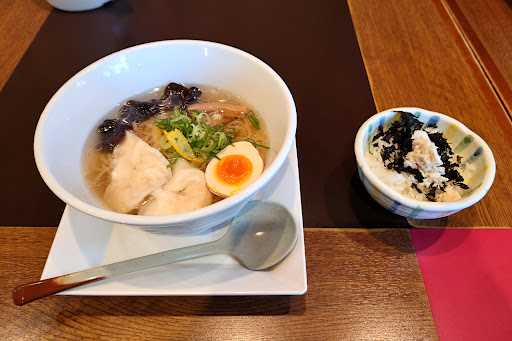 期間限定メニュー 鯛塩ワンタン タネがしっかりある海老ワンタン2個に柚子が入った甘くちの塩スープであっさりして食べ易い 鯛ほぐしご飯が基本セットなので少食な人だと量が多いかも 海苔と魚の味がしっかりあるのでスープかけても良いかも ワサビが添えてあれば良かった