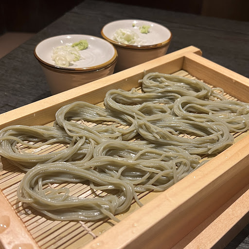 〆にチョイスしたのは、新潟名物の「へぎ蕎麦」。 「へぎ蕎麦」とは、つなぎに布海苔という海藻を利用することで、緑のそば。 越後地方では、「へぎ」と呼ばれる杉で作られた容器に盛り付けられて提供されることから、その名前がついているのだとか。