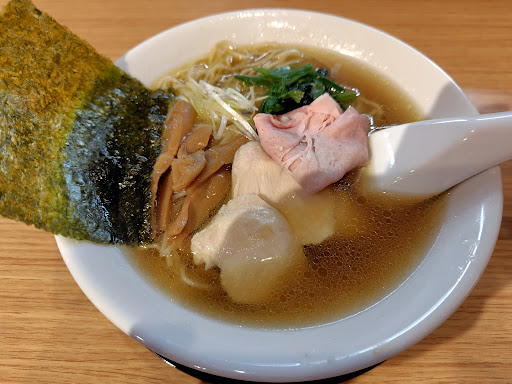 Read more30分近く前から行き、15分前から並び始める。まず、気になったのは、駐車場が狭く、前進で入ってくる車が駐車できずにとても苦労している人ばかりであったと言うこと。 お店には道路側からバックで入ってくることをお勧めする。ただし、歩道があるので、歩行者には要注意! ラーメン上白湯塩、上白湯醤油+ローストポークトッピング、餃子を注文。唐揚げが食べたかったのだが、自販機には×マークが表示されて購入不可となっていた。女性店員に確認すると、本日分は昼で売り切れたとのことだったので諦めた。すると、その15分後辺りから、自販機の×を◯にするように女性店長からスタッフに指示が出て、売り切れだとして注文できないはずの唐揚げが、客用に調理され用意されており、先の客達にはそれは知らされなかった。先の客へ店内でアナウンスしたり、希望のある先の客には、優先で追加注文を受け付けたりなど配慮があればよかったと感じた。せめて問い合わせした人くらいには配慮してくれたらよかったなぁ。 ただアナウンスされただけだと、このお店は自販機で食券を購入してから注文の方式なので、行列ができている自販機に、その時点からまた並び直して食感を買うことは現実的ではない。 単に、開店前の準備不足だろうと感じた。 ラーメンは、美味しかった。鶏ハムは柔らかく、ローストポークも柔らかくて美味しかった。 とろみのあるスープは塩味強め。 スープの量はもう少し少なくてもいいかも。 麺は固茹でな感じ。麺の太さは細麺には感じないが、細麺だったのかな。極細麺だと更にスープに絡んでよかったかも。 餃子は、皮が分厚いタイプで、食べ応えがある。好みではなかった。 お水は、セルフサービス。 食券自販機の隣にあり、買ったらすぐにお水持って着席できて、動線がよいと感じた。 このご時世、飲食店で店内に客様にあちこち設置してあるというお店にしか出会ったことがないので、手指消毒製剤が当たり前に設置していないことに驚いた。 また、着席した時に荷物置きのボックスがないことにも驚いた。 更にあるといいと感じたのは、おしぼり。 新しい店舗で、床も新しめに感じたが、長年の店の様にベタついているのは、全店舗からの床だったのだろうか。