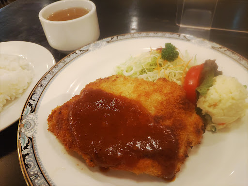 肉はフワフワで脂ののった鶏モモ肉は、アラフィフおじさんには少し重いが、ソースはあっさり仕上げで食べやすい。ちょっと辛みのあるポテトサラダが絶妙な箸休めになっている。全体的に何もかもが懐かしい昭和なチキンカツでした。
