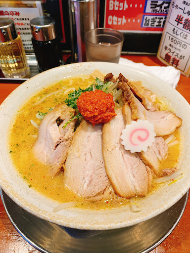 Read moreだるまやグループで人気のラーメン屋さんですが、初めて訪問しました。 1番人気の辛味噌チャーシューに味玉トッピングと、チャーシュー飯+からあげセットを頼みました。白味噌ベースのスープは少し薄味で、まあまあ美味しいです。辛子味噌がアクセントになります。チャーシューはトロトロ系で美味しいのですが、私はトロトロ系の脂がキツくて苦手です。チャーシュー飯はマヨネーズが要らないかなと思います。からあげは竜田揚げっぽい感じで、こちらもまあまあ美味しいです。 全体的に脂っこくて気持ち悪くなってしまいました。開店時間でもお客さんが多くて人気店ですが、私とは相性がイマイチでした。 接客はとても良かったです。 駐車場がちょっと狭くて、目の前の道路は交通量が多い交差点なので渋滞します。出...
