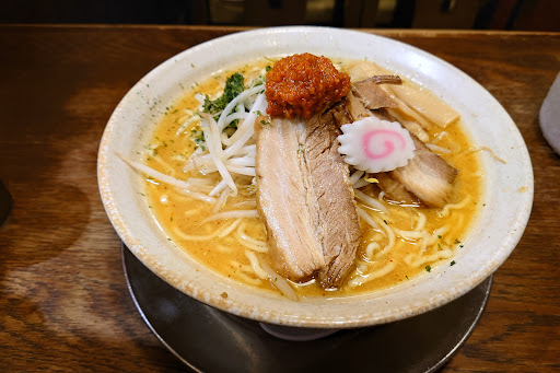 新潟生まれのからし味噌ラーメンがお店の看板メニューで動物系×魚介系のWスープにニンニクの効いた辛味噌が乗ってるのが特徴!この特製からし味噌を溶かして食べるこの一杯がクセになるんです。