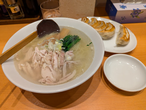 2024.12 鶏ラーメンと餃子を頂きました🥰 ラーメンは鶏の旨味がたっぷり入ったふんわりとした優しい塩加減のスープにもちっとした多加水の細麺がうまい💕 トッピングには粗く解されたしっとり鶏むね肉👍 美味しかったです