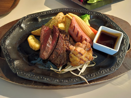 続いて30分くらい待ってメインのリブステーキ、越の鶏のグリル、黄金フランクが鉄板に乗ってて、調理終了した料理が配膳カウンターにたくさん並んでいて出す前に火が通り過ぎたのかな、ステーキも鶏肉もちょっと固い。ソースはウスターソースとケチャップを混ぜた感じでちと甘め。鉄板なのに程よく温かくて(冷めてて)食べやすい😁