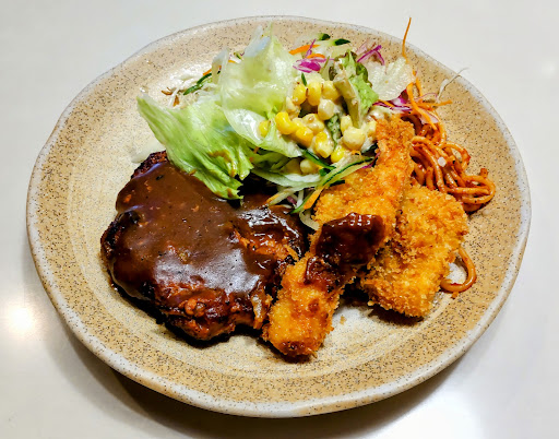 2022.9 ハンバーグ、イカ、エビフライを定食、大盛で。相変わらず、ご飯の炊き加減が絶妙。新米になれば、更に、美味しくなりそう。