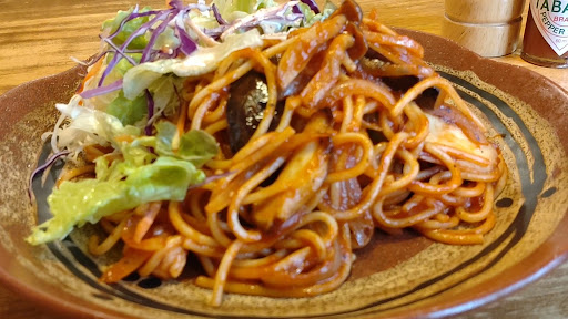待望のナポリは、サラダとともにワンプレートで登場。カップスープはお味噌汁。 ナポリタンは、「あの食感」「あの味」です。やや太めの麺がしっとり柔らかく、ケチャップの味を和らげつつ絡み合っています。 しめじと茄子がふんだんに、あとはピーマンと玉ねぎでしょうか、お野菜たっぷり。 ボリュームも十分です。