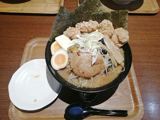 腹ペコのため、ボリュームのある男前味噌󠄀らーめん(麺量300g)をオーダー。 麺量は90g〜300gまでをセレクトできるシステムでした。 着丼すると圧巻のボリュームとフォルム!! 具はごま、背脂、ネギ、モヤシ、メンマ、チャーシュー、焼き海苔、バター、煮玉子、から揚げが乗っており盛り沢山でした。 スープは、濃厚系の味噌󠄀で背脂とバターがあったからか濃厚かつこってりとしていました。濃厚味噌󠄀ラーメンが好きな方は、ハマる味かと思います。 麺は濃厚味噌󠄀ラーメンによく合う太縮れ麺で、茹で加減良く、麺はモチモチ感あり、麺のコシも程良く感じる美味しい麺でした。 ボリュームは、麺量300gかつ圧巻の具の多さで大食漢の私もかなり満腹になり、大食いな方も「男前味噌󠄀らーめん」は満足な量ではないでしょうか。 個人的には、バターや唐揚げが最後までこってり感を胃袋に刺激しますので、取皿に取り、お好みでミックスするのが良いかと思います。私は、バター無しのスープの方がイケた口でした。