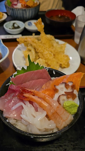We started with oysters and scallops, both fresh and flavorful, before deciding we wanted a little more before our sake distillery tour. The sushi train nearby looked tempting, but the line stretched far too long. That’s when we noticed Niigatasengdonya, known for its donburi bowls. The menu offered a wide range of combinations that allowed Mike to try several types of fish he had never experienced before. We also added a platter of tempura featuring prawns and oysters. The oysters in particular were huge, plump, and briny, the kind that makes you stop mid-bite just to appreciate them.