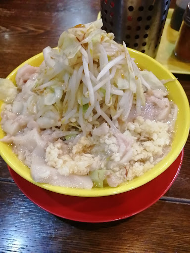 Read more平日開店直後に入店。 開店前から結構並んでいてびっくり。 かろうじてファーストロット。 券売機で並と生卵を購入。 入って左側の給水機で水を汲んでから着席。 助手の方2人と店主らしき方で回している。 座って程なくしてコール。 アブラとニンニクをお願いする。 調理は店主さん1人でやっているのでなかなか時間がかかる。 その上お客も二郎系に慣れてない人が多く、コールでもたつく人多くて余計に時間がかかる。 20分ほどで着丼。 まずはスープから。 透明な液体アブラが表面を覆っている。 非乳化で非常に大人しい味だ。 うん。 二郎ってこんなもんだよね。 最近のラーメン屋って美味しさを追求するあまりどんどん味が濃く、極端な方向にいってるところが多い。 二郎系でもカエシをガツンと効かせ、凄まじく濃厚なところが主流になってるが、元々はこのくらいの感じだったよなー。 これならスルスルと食べられる。 野菜はややシャキ。 アブラは味ついてないので、テーブルにあるラーメンのタレを回しかけて食べる。 ニンニクは増しても少なめ。 なのでニンニク好きはマシマシ必須。 麺は何と四角い断面のモチモチ麺。 こういう麺すごい好き。 麺自体はすごい美味い。 ただ、こういう麺はここみたいなスープには決定的に合わない。 スープがそれほど強くないので、麺の存在感に圧倒的に負けてしまっている印象。 こういう麺には、もっと濃厚で強烈なスープを合わせるべきだろう。 逆にこのスープには平打ちやわ麺が合うだろうな。 とてももったいない。 秋葉原店にいった人たちの麺がなー・・・という評価がよくわかった。 あれは麺が美味しくないって言ってるんじゃなくて、麺とスープが合わないって言ってたんだな。 とても納得。 なので麺に合わせるべく、ラーメンのタレを更に3回しほど投入。 これなら生卵はいらなかったな。 麺は大好き。 スープも嫌いじゃない。 でも評価は星3。 これはもったいない。 この麺に合ったスープにするか、もしくはスープに合った麺に変えるか。 それぞれどちらのラーメンも食べたいが、現状でもオペ遅いから2つのラーメンを出すのは難しいか。 あー、も...