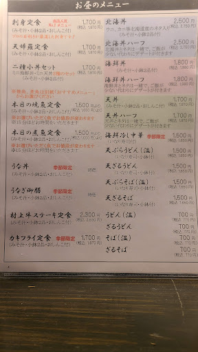 Read more村上牛のステーキなどもありますが、魚料理メインのお店。可もなく不可もなく。刺身盛合せ、驚きはありません。煮魚も、2枚におろされたもので、一匹ものではありません。 以前は、靴を脱いで、座布団席に座るタイプでしたが、椅子席も、共存するようになり、隣席を見下げるのも、見上げるのも好きではないので、カウンター利用します。料理の提供は、早くないので、ゆっくり飲みながら待つ感じです。 あれこれ頼むと、お高くなりますので、定食を、頼むとよいかも。女子会や、誕生日など、フルーツのサービスもしてくれます。奥に、宴会のできるお部屋もあります。焼き魚、煮魚、オードブル等の、...