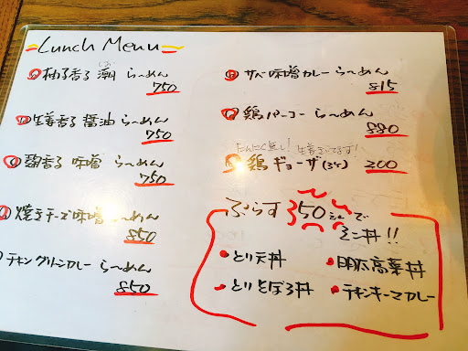 前に飲み会の後で食べて美味しかったので、今回はランチに訪問してみました。 ランチメニューのお得さに驚きです! しゅうまいランチを塩らーめんで頼みました。 塩らーめん、美味しいです。 鶏の旨味があふれるスープに、少しかための細麺がとても合います。 なんこつしゅうまいはカラシを付けていただきました。 鶏なんこつのコリコリした食感が心地良く、とても美味しいです。 鶏餃子も同じく鶏なんこつが入っているのでしょうか。 タレなど付けなくても、そのままで美味しい餃子です。 麺を大盛りにして白飯まで付いているので食べごたえはバツグン。 満腹、満足。 美味しい食事をお得にお腹一杯食べられて、とても満たされた気分になりました。 とても美味しかったです♪ ごちそうさまでした☆