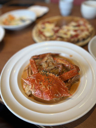 渡り蟹がまるまる一匹乗っているパスタは見た目からインパクトがありトマトクリームの風味と蟹の旨みが若干感じられます。 マルゲリータは安定の美味しさ、ここのピザは薄めで耳がサクサクしていました。バジルの風味がしっかり感じられチーズがたくさん乗っていて良かったです。
