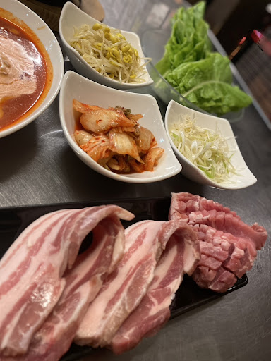 サムギョプサル食べ放題 先にチゲやチヂミ、チャプチェなどがでてきます。 焼き方がわからないと伝えると先に焼いて説明をしてくれました。 ここまではよかったのですが、その後持ってきたお肉の部位が何なのか説明がなく聞いてもどこでしょう?と苦笑いされ終わり。 アルバイトなのかもしれませんがさすがに提供しているお肉の部位くらいは把握しておいていただきたいなと思います。 その後同じお肉を注文したいときに困ります。