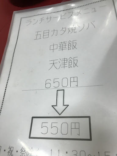 今回は口コミ写真に無かったのですが、カタヤキソバをいただきました。 あんかけはトロミ抜群、野菜は少し少なめでもボリュームあり。 ランチタイムは11時半から15時と優しい設定で、ランチは100円引きの600円(現時点) 普通にお腹いっぱいになります。