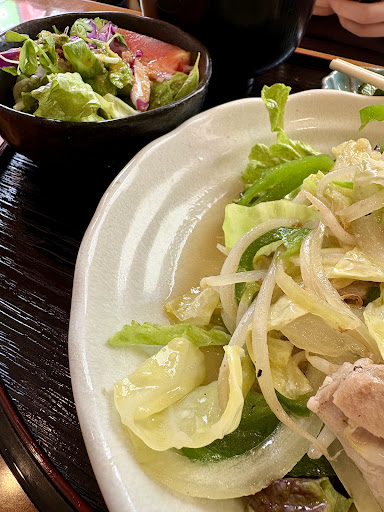 サラダのドレッシングはニンニク風味?でオリジナル感満載で大満足。 そして野菜炒め定食もバターの味がよく効いてうますぎ謙信。 思わず心の中でガッツポーズ。