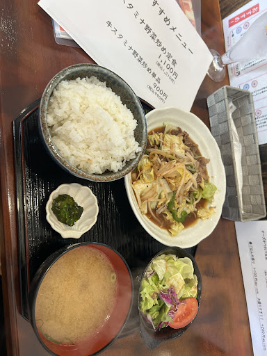おすすめランチメニューの牛スタミナ野菜炒め定食1210円ご飯大盛り110円を頂。 その他ランチメニューも定食が10種類ほどスタンバイ🕺🏼