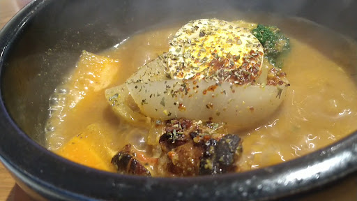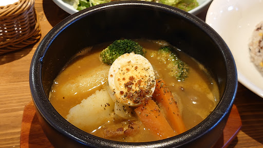 きのこサラダは湯気が立ってました これがめちゃ美味しくて◎ からのメイン レギュラースープカレー到着。 グツグツした状態で…猫舌には危険度MAX😹 具材は大き目で ジャガイモ、人参、ブロッコリー、鶏肉、ゆで卵(半分)、玉ねぎが確認できました。 メニューを読むと スープカレーを別皿のご飯にかけるとのことで 少しずつ頂きました。 熱々の具材は、ひと口大に崩して 食べる必要がありますね。 具材とスープカレーの辛さの相性は◎ 鶏肉もゴロっと大き目で食べごたえありました👍 ご飯をLサイズでサラダも食べると お腹はいっぱいになりました😋