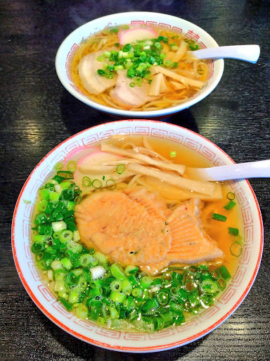 普通の中華そばとたい焼きラーメン餡じゃないを頂きました。 麺は太麺でうどんのようなもっちりとした麺。スープは透明なあっさり味でした。中華そばには柔らかいチャーシューと蒲鉾が2枚ずつ乗っていました。たい焼きは揚げ天?のようなモノ(練り物?粉物?)で、中身はタコとか野菜とか色々と入っていました。青ネギの大海原を泳ぐたいやきくんのような見栄えでした笑
