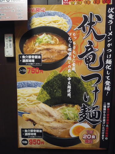 Read more5年以上来てなかったと思いますが久しぶりにお邪魔しました。 こちら伏竜さんは群馬県埼玉県で見かける優勝軒の系列ですね。 入り口に券売機があり、伏竜ラーメン、野菜ましラーメン、チャーシュー麺、魚介とんこつなどがありました。辛味噌はよくあるシビレ系のやつで辛さを増せるそうです。 こちらでは伏竜ラーメンしか頼んだことがありませんが以前はつけ麺もあったような。。 その伏竜ラーメン、注文時に醤油、味噌、塩、黒醤油の中から味を選べます。醤油、味噌、塩は食べたことがあり塩が一番好きだった記憶から塩をお願いしました。 黒醤油が何だか気になってアルバイトらしき店員さんに訊いてみましたが、はっきりとした答えを得られず。次回頼んでみよう。 ついでにアブラとニンニクマシでお願いしました〜。 作ってるところを見ていないのでどうやったかわかりませんが、野菜(もやし100%)にアブラが絡んでいます。野菜と和えたか上から擦ったかで細かいアブラが野菜と合わさりとても美味しいです。 スープはそうそうこんな感じだった。 分類すれば二郎系ですが似て非なるもので角ふじやとんしおとほぼ一緒。 麺こんなだっけ?つるつるもちもちした麺です。私は好きじゃありません。 ちなみに頼んだのは中盛で麺量は360g、器にみっちり入ってました。 この他に平日ランチサービスの餃子ライスセット(200円)も頼んであって結構厳しいかも。。 と少し後悔してしまいました。 餃子は特別美味しくはありませんが、お値段的にかなりお得に感じます。また、ライスは大、中、小から選べ、ここも大選んだため私的にやり過ぎてしまった感満載です。 ラーメンに戻りますがチャーシューは豚バラを炙ったもので柔らかくなかなかかな? それと卓上にある辛ニラ、ニラを豆板醤とコチュジャンとかで和えたものでしょうか? なんか甘さがあり、その甘さが邪魔をしてあまり美味しくはないです。。が、無料のものなので文句を言うなら食うなってのが当たり前ですね。 でも、後半残しそうになったライスを掻き込むためにこの辛ニラのお世話になってなんとか完食。 なんでか塩ラーメンに入ってないはずのメンマの味がしました。中華スープなのかな? 確か以前は週替り化月替りとかでサービスメンマとかサービス野菜とかが張り紙してありましたが今回は見当たらず、もう辞めてしまったのかもしれません。 こちらにしばらく来ていなかったのは、単にお昼時に通ることがなかったからなので、また近くを通ることがあれば寄りたいです。 その時は黒醤油かな。 こういったチェーン店っぽい二郎系って何度か通ううちに味に飽きてしまい個人的に評価が下がっていくのですが、伏竜は今のところ評価が下がってません。 お店の雰囲気もいいし、座席の感覚も広いし味に関しても気に入っているので知り合いにも...