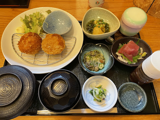 豚タンシチュー豆乳グラタン膳1200円 膳には茶碗蒸し 冬瓜の豚肉餡掛け 刺身は鯛と鰹 小鉢 味噌汁 ご飯が付き豪華です。 広島産牡蠣フライ膳1200円も同じです。 他に単品注文できるおかずも有り 隣客が注文していた和牛入りメンチ700円も頂きました。 リーズナブルながら手作りのお料理どれもこれも美味しく頂きました。