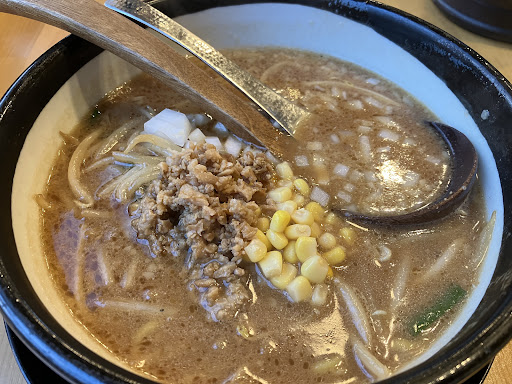 Read more前々から来たかったこのお店。味噌ラーメンの専門店だ。付近は味噌ラーメン専門店がひしめく激戦地、門左衛門、くるまや、そしてココ。 ノーマルな味噌ラーメンで麺少なめを指定。 店内は広々としていてロボット配膳も行うらしい。 いよいよ着丼、香りは少し獣臭が。決して悪い匂いではなくいわゆる二郎系の香りにちょっと味噌風味。 スープをひとくち、複雑な味噌味だ。味噌と豚骨その他いろんな味と香りが口の中を乱反射する。二郎系ラーメンの好きな人にはたまらない。 これは純粋なガツンと味噌ラーメンのくるまやと対照的だ。 麺は中太の縮れ麺、スープによく絡むモチモチ麺。野菜はもやし少なめで少し物足りない。チャーシューの代わりに肉味噌。これは少しクセのある味だ。 無料の使い捨てエプロンがあるのが嬉しい。 特筆は優秀な調味料群、左から山椒、豆板醤、一味、ニンニクだ。 ニンニク入れると美味しくなるが元の味を見事に消し去る。旨みのあるスープの味を残しつつ一番良かったのが豆板醤。僕の大好きな辛味噌ラーメンに変身する。一味だけではちょいと軽すぎる。山椒も面白いのでこれを少しかけるのも悪く無い。 と、濃厚な味噌ラーメンを十分楽しんでご馳走様。電車の駅はなく、車でのアクセスになるが...