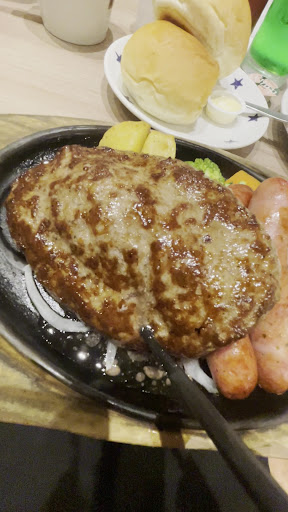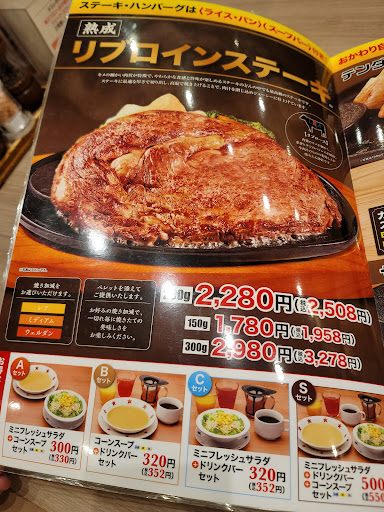 Read more激熱ステーキ200g(サラダドリンクバーセット)とあらびきハンバーグ250g(サラダドリンクバーセット)と子供用プレートを頼んだ。 スープバーがメイン料理についてるのだが、スープバーが2つとも空で店員にいったら、マイペースの店員が焦りのない返事と行動。 (スープの味も個人的にはガストの方が好き)