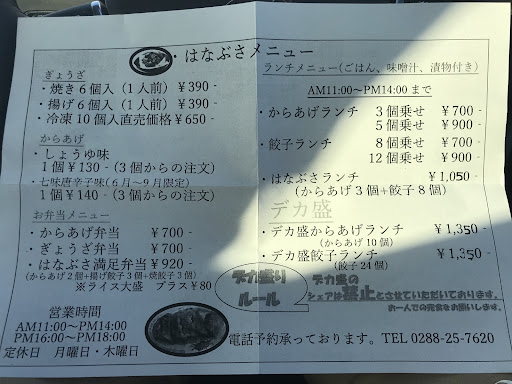 家族3人分なので、お弁当を2個買いましたがとにかくそのボリュームにはとても満足でしたw そしてまずは唐揚げ、ころもがさくさくで肉にもしっかりとした味がして、めちゃくちゃ美味しかったです。唐揚げ好きの妻も娘も絶賛でした。また、一つの大きさもとても大きく食べ応え満点の唐揚げでした。 そして餃子、焼き餃子と揚げ餃子が入っていて、焼き餃子は、かなり高レベルで美味しかったです。揚げ餃子も、周りはパリッと、中はジューシーで幾つ食べても飽きない美味しい餃子でした。 総合的にかなり高評価で、とても満足出来ました。 店員さんの対応もとても良く、日光にお出かけした際は、また是非食べたいと思いまし...
