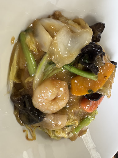 本日はぷりぷり海老の塩あんかけを。 何と選べる焼きそばorご飯!(丼になってます) 名前の通り海老は大きくてぷりっぷり入っており、味自体も塩あんかけだからか、中華風のしっかりとした味ながら、優しいお味でした。他の白菜や人参、タケノコ、しめじ、ベビーコーン…人参に至っては、なんとさり気ない飾り切りが施されてて驚きました。焼きそばもご飯も、普通の量かと思います。特にご飯は、見た目が白いお皿なので少なそうに見えて、結構入ってる印象でした。