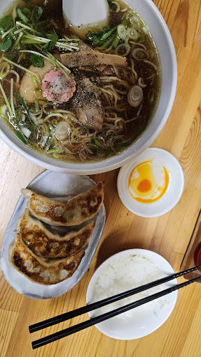 Read more¥1200 Gyoza Ramen Set came with 3 freshly made pork gyoza that were juicy and piping hot, served with a small bowl of rice, which I really did not need. The huge bowl of ramen has unique tasty broth that is unlike any other soy sauce ramen I have tasted. The ramen was springy with a light tasty soup that wasn't salty at all. Makes me wonder how they made the base.