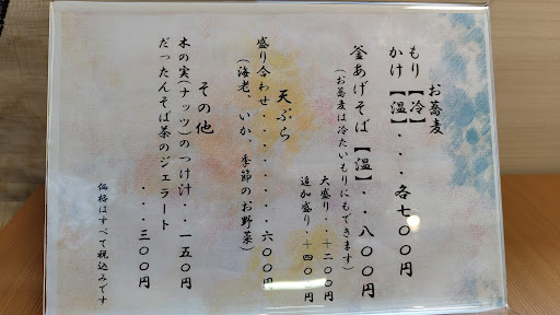 Read more盛りそば大盛と天ぷら盛り合わせを戴きました。 先ず特筆すべきは「値段が安い」大盛り九百円、天ぷら盛り合わせに至っては六百円合計千五百円は安い。 天麩羅ば茄子・ズッキーニ・エリンギ・モンゴウイカ・エビと普通、だいたい千五百円は天盛り蕎麦価格です。 あ〜因みにお品書き品目は少なく【もり・かけ・蕎麦の実入りイナリ・ジェラート・天ぷら盛り合わせ・ナッツ入り蕎麦つゆ・お飲み物あったかも・・・】です。 こう言うお店は【掻き揚げ】とか凝ってたりしますが、此処はナッツ入り蕎麦つゆでした。 皆さんナッツ入り・・・そばを作ってる間に蕎麦つゆ容器のナッツを磨り潰してましたが私は頼みませんでした。 蕎麦は蕎麦風味薄く感じませんでした。 食通でも蕎麦通でもないのでハッキリ言えませんが蕎麦の分量的は意外と少な目かもしれませんし、私が通販で良く頼む業務用十割蕎麦に似てました。 業務用十割蕎麦は十割蕎麦なのに茹でても切れ難く歯応えとかは結構有り、手打ち蕎麦とは何となく違う温蕎麦にした方が美味しい蕎麦です。 まあ店内は狭くカウンター5人、2人掛...