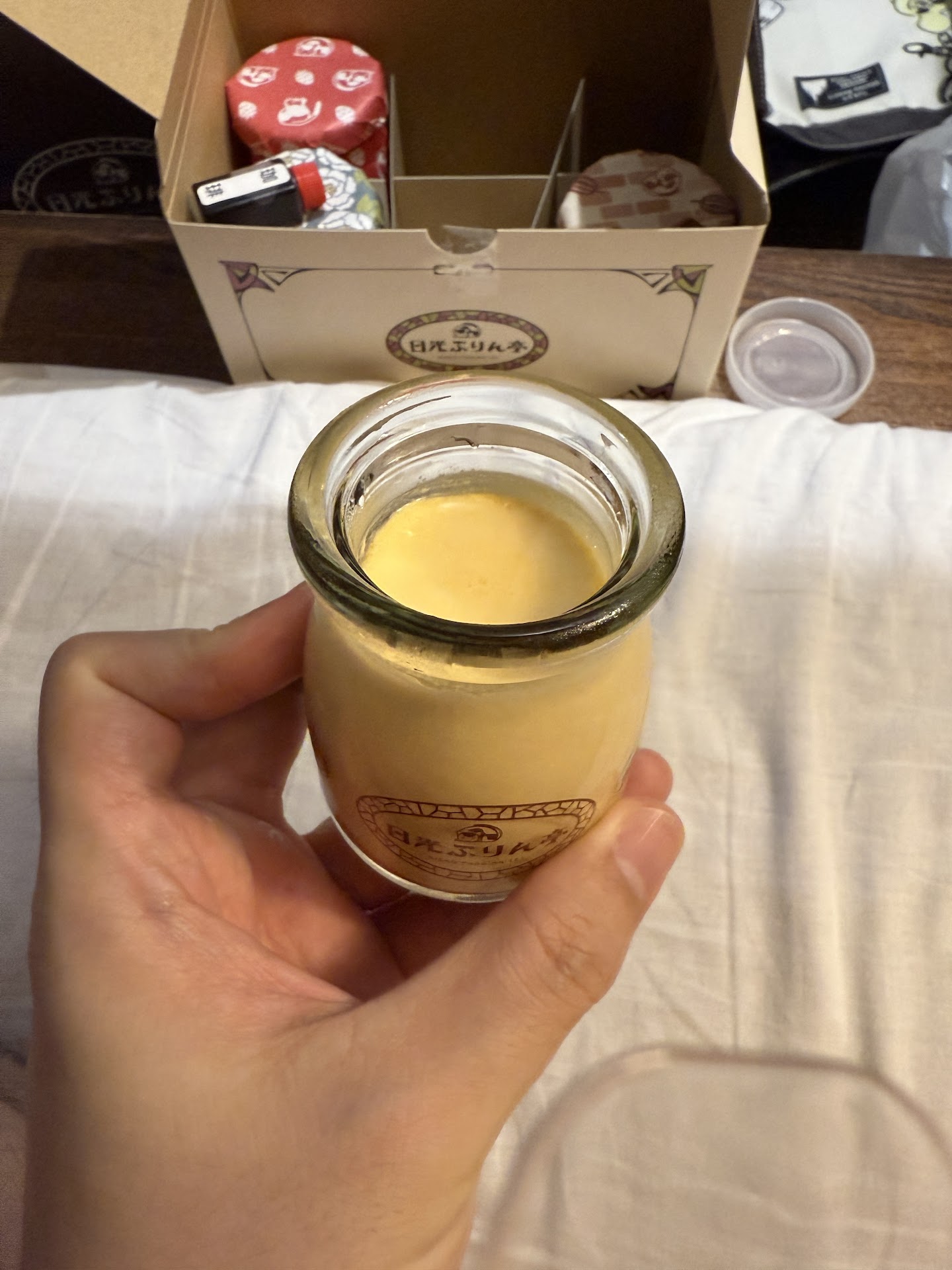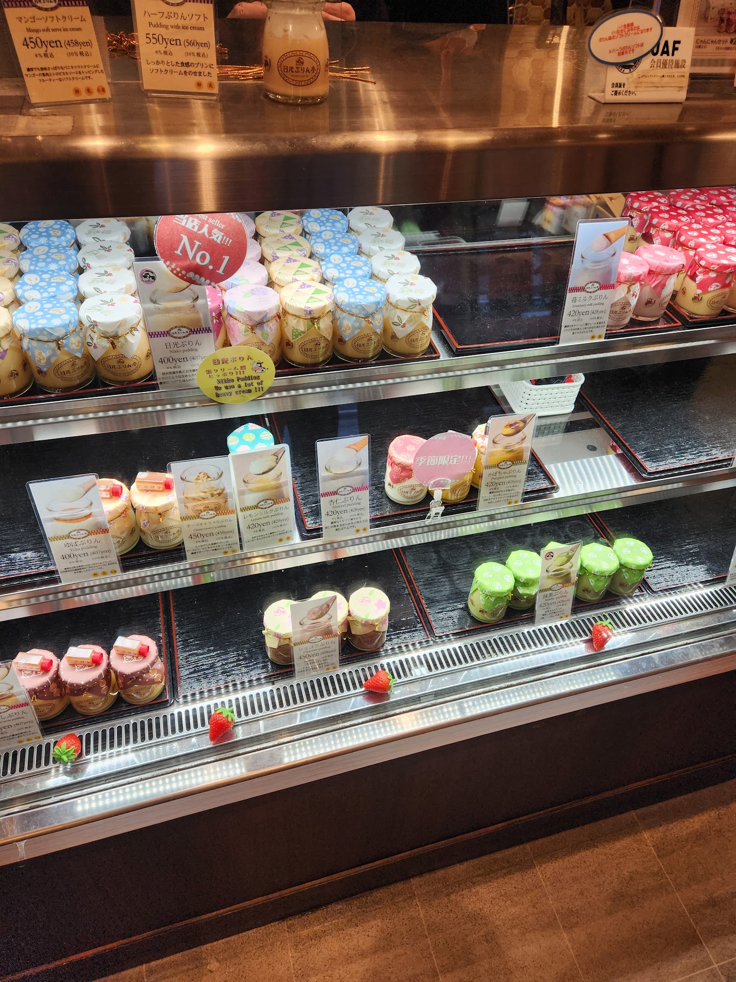 This pudding specialty shop is clearly beloved by both tourists and locals in Nikko, offering various flavors in cute bottles including an unusual soy sauce-topped version that tastes like dipping eggs in soy sauce. The pudding has an interesting texture - less like typical jiggly pudding and more like a smooth, non-Newtonian fluid that creates a uniquely creamy mouthfeel.
