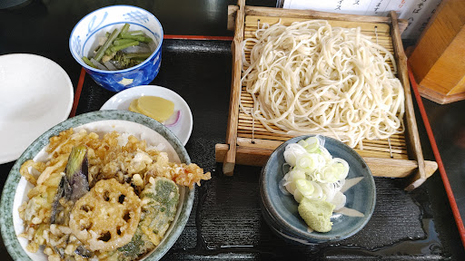 私は千円のおかめセット。 半ライス丼と書いてあるが他店の一人前はあるご飯の上に(来店のとき)海老、舞茸、蓮根、茄子、ピーマンが鎮座していた。 天ぷら自体は揚げる温度が少し低かったのか、少し油っぽさは合ったものの十分満足出来る。 蕎麦は更科だと思われる白い蕎麦。 手打ちで太さがバラバラは否めないがコシは有ります。葱も多めに添えられてあり、山葵は練りと生を合わせたような山葵。