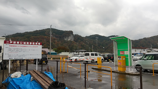 駅に向かって入って行って左側に駐車場が2つ。左手前は旭商事の有料駐車場。奥の市営が2時間無料の駐車場です。