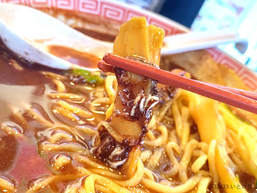 【麺】 麺はおなじみの多加水の中太麺を使用。 さらっとしたスープにそこまで絡まず、幸楽苑の麺を楽しめますね^^ たまにチョコや生姜の風味が鼻をすり抜けますな~。