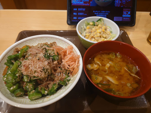 Read more大晦日の夜、初詣の前に伺いました。 さすがに、店内は自分ひとりでした。 ドライブスルーのお客様が多いようでした。 暮れと言う時期もあるのでしょうか? 注文は迷った結果、オクラTPと豚汁とサラダを頂きました。 注文するとき、慣れてなくてバラバラで送信した後、運ばれたどんぶりにかぶりついていたら、店員の方がレシートを持って「セットの方がお安くなるので…」とレシートを取り替えて頂きました。 当たり前のオペレーションなのでしょうが有難くて嬉しく美味しくいただきました。 『ありがとうございますました。』